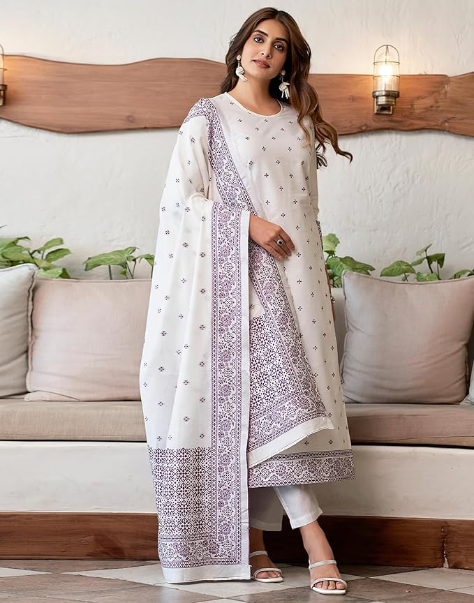 Kurta Fabric:: Cotton | Kurta Work:: Jacquard ||Pant Fabric::Cotton | Pant Work::Solid (With Pocket) || Dupatta Fabric:: Cotton| Dupatta Work:: Solid, Jaquard Kurta Color:: Off White || Pant Color::Off White || Dupatta Color:: Off White, Dark Magenta Readymade outfit kurta Set that offers convenience without compromising on style, Perfectly suited for all occasions, from spring and summer events to office and official settings.