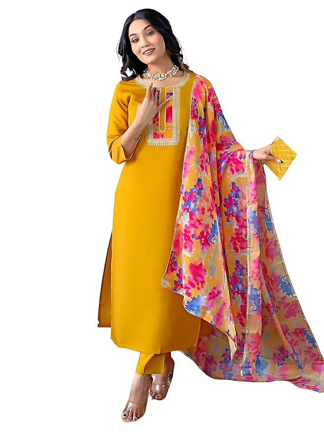Kurta Work:- Embroidered || Dupatta Work:- Printed Package Contains:- 1 Set : KURTA, PANT AND DUPATTA For the best fit, please refer to our size guide. If you're between sizes or unsure, we recommend choosing the next larger size. Care Instructions: Hand Wash Only